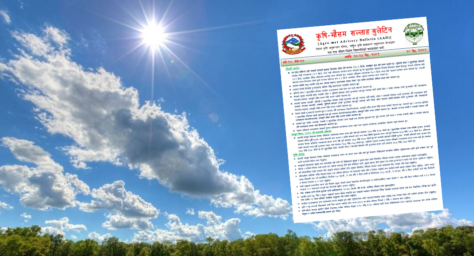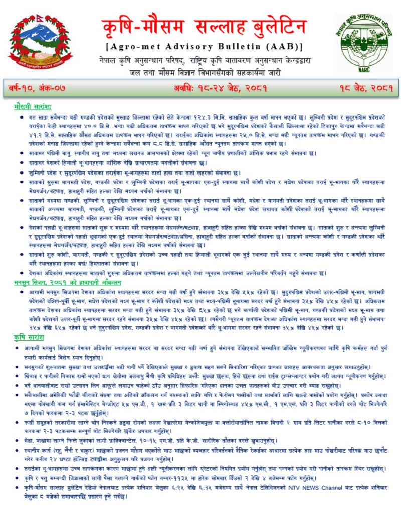 कृषि मौसम सल्लाह बुलेटिन नेपाल कृषि अनुसन्धान परिषद् नार्कको राष्ट्रिय कृषि वातावरण अनुसन्धान केन्द्रले जल तथा मौसम विज्ञान विभागसँगको सहकार्यमा तयार पार्छ ।