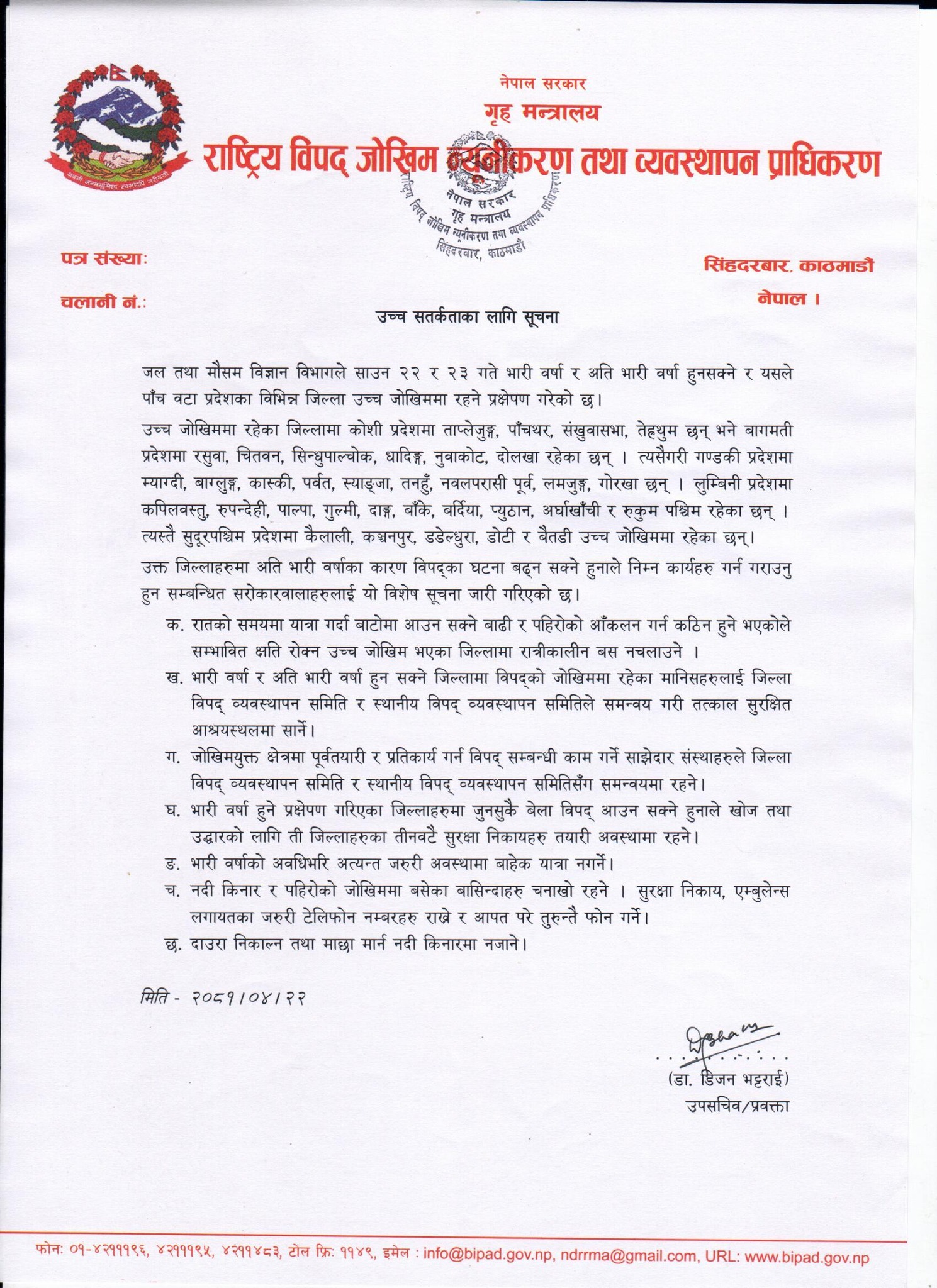 साथै भारी वर्षा र अति भारी वर्षा हुन सक्ने जिल्लामा विपद्को जोखिममा रहेका मानिसलाई जिल्ला विपद् व्यवस्थापन समिति र स्थानीय विपद् व्यवस्थापन समितिले समन्वय गरी तत्काल सुरक्षित आश्रयस्थलमा सार्ने व्यवस्था गर्न आग्रह गरेको छ भने जोखिमयुक्त क्षेत्रमा पूर्वतयारी र प्रतिकार्य गर्न विपद् सम्बन्धी काम गर्ने साझेदार संस्थाले जिल्ला विपद् व्यवस्थापन समिति र स्थानीय विपद् व्यवस्थापन समितिसँग समन्वयमा रहन जनाएको छ ।