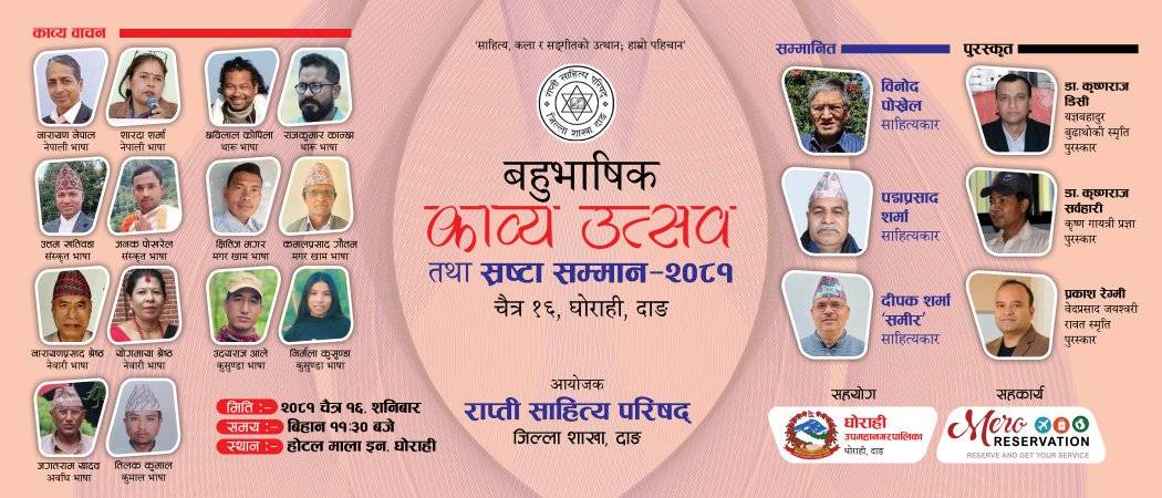 घोराही। राप्ती साहित्य परिषद् दाङ शाखाले यही चैत १६ गते शनिबार घोराहीमा बहुभाषिक काव्य उत्सव तथा श्रष्टा सम्मान कार्यक्रम आयोजना गर्ने भएको छ। परिषद्का शाखा अध्यक्ष यम रेग्मीको अध्यक्षतामा बसेको बैठकले विभिन्न भाषाका साहित्यकार तथा श्रष्टाहरूलाई छनोट गर्दै कार्यक्रमको तयारी अघि बढाएको छ।