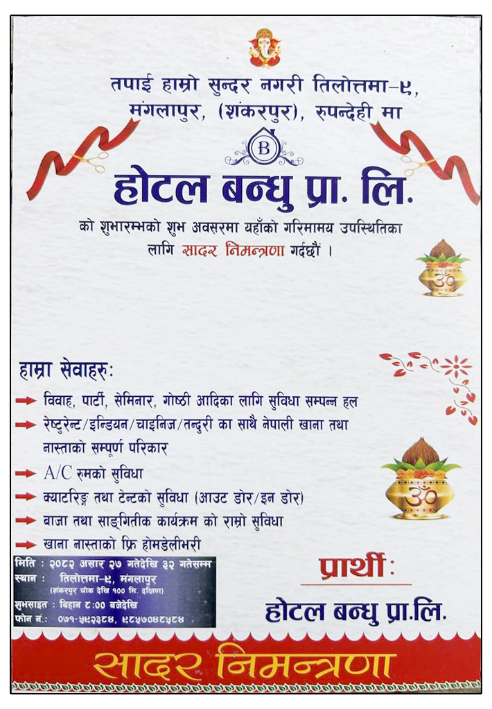 शंकरपुर चोक बाट १०० मिटरको दक्षिणमा रहेको होटल बन्धुमा असार २७ गते देखी ३२ गते सम्म होटलको उद्घाटन समारोह रहेको छ ।