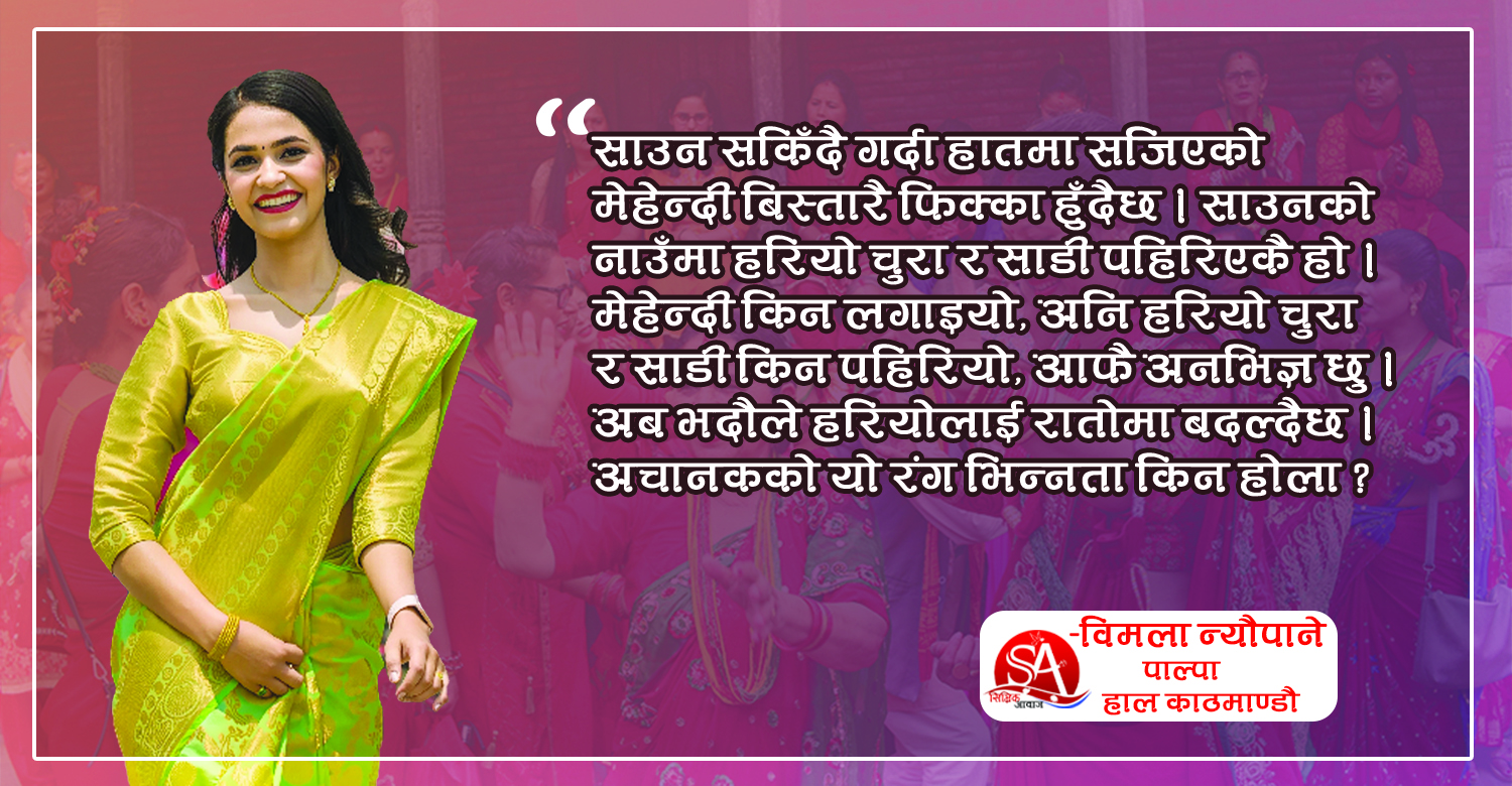 साउन सकिँदै गर्दा हातमा सजिएको मेहेन्दी बिस्तारै फिक्का हुँदैछ । साउनको नाउँमा हरियो चुरा र साडी पहिरिएकै हो । मेहेन्दी किन लगाइयो अनि हरियो चुरा र साडी किन पहिरियो, आफै अनभिज्ञ छु । सायद देखासिकी हो, या रहर । अब भदौले हरियोलाई रातोमा बदल्दैछ । अचानकको यो रंग भिन्नता किन होला ? परम्पराको नाममा आधुनिक होडवाजी त होइन ? सोच्दैछु ।