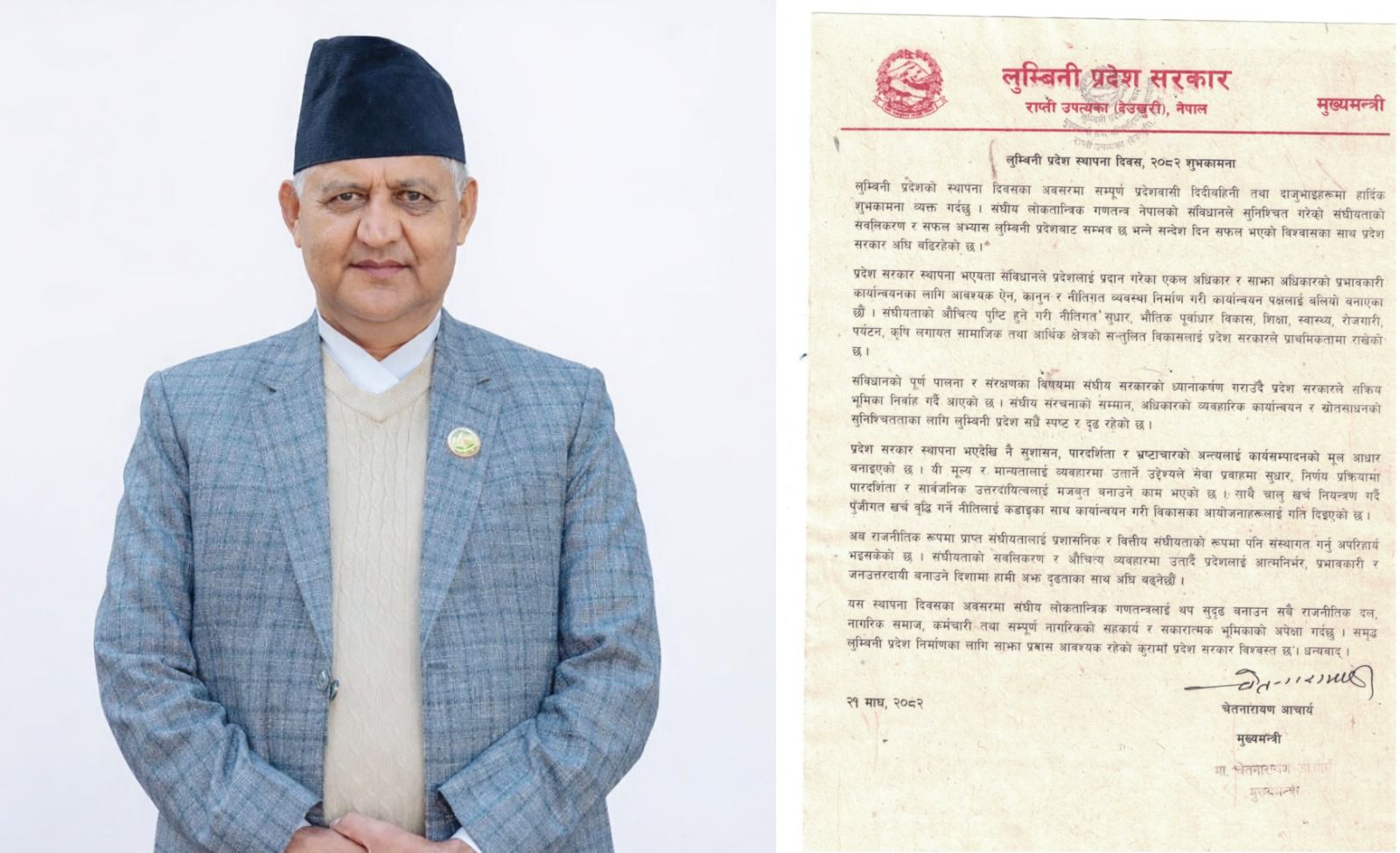 दाङ । लुम्बिनी प्रदेशका मुख्यमन्त्री चेतनारायण आचार्यले संघीयताको सवलिकरण र सफल अभ्यास लुम्बिनी प्रदेशबाट सम्भव भएको सन्देश देशभर दिन सफल भएको बताउनुभएको छ । प्रदेश स्थापना दिवसको अवसरमा बुधवार एक शुभकामना सन्देश जारी गर्दै मुख्यमन्त्री आचार्यले प्रदेशलाई आत्मनिर्भर, प्रभावकारी र जनउत्तरदायी बनाउने दिशामा सरकार दृढताका साथ अघि बढिरहेको स्पष्ट पार्नुभएको हो ।