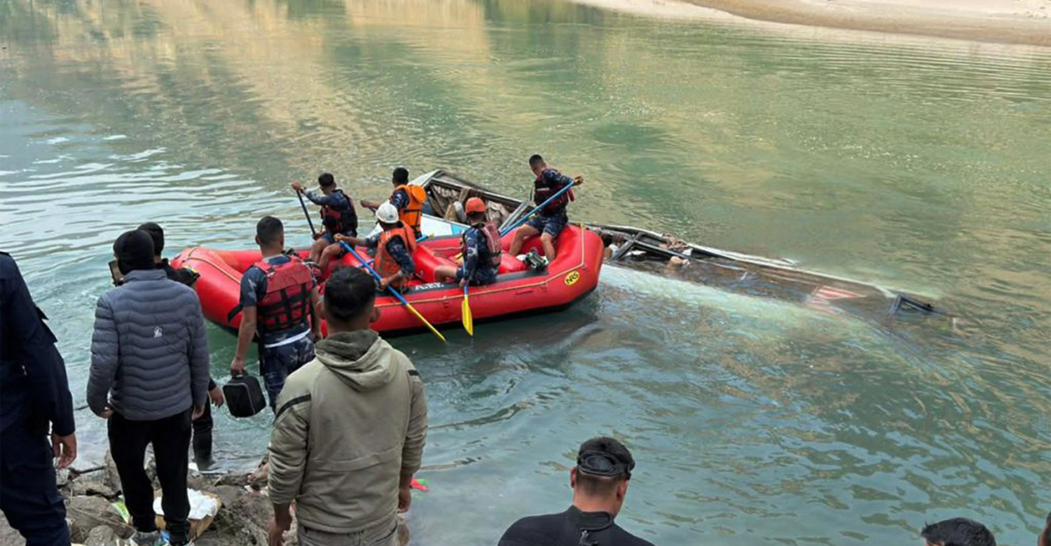 सुरक्षाकर्मीको टोली उद्धारमा खटिएको छ । सडकबाट खसेको बस नदीमा डुबेको छ । अन्य यात्रुहरुको सशस्त्र प्रहरीको गोताखोर टोलीले खोजी गरिरहेको छ ।