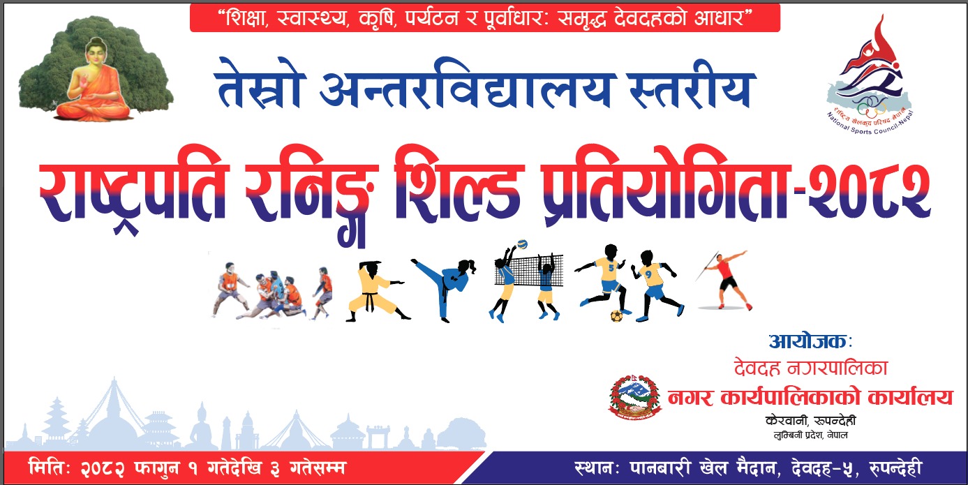 देवदह । देवदह नगरपालिकामा यहि फागुन १ (भोलि) देखि ३ गतेसम्म तेस्रो राष्ट्रपति रनिङ शिल्ड प्रतियोगिता हुने भएको छ।