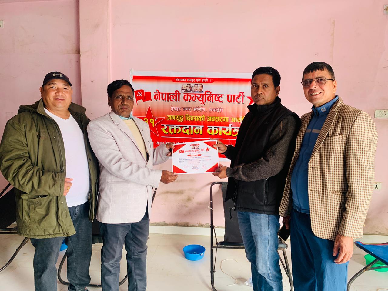 देवदह । ३१औं जनयुद्ध दिवसको अवसरमा देवदहमा रक्तदान कार्यक्रम सम्पन्न भएको छ । शुक्रवार नेपाली कम्युनिष्ट पार्टी नगर कमिटिको योजनामा सम्पन्न कार्यक्रममा ४५ पिन्ट रगत जम्मा भएको जनाइएको छ ।