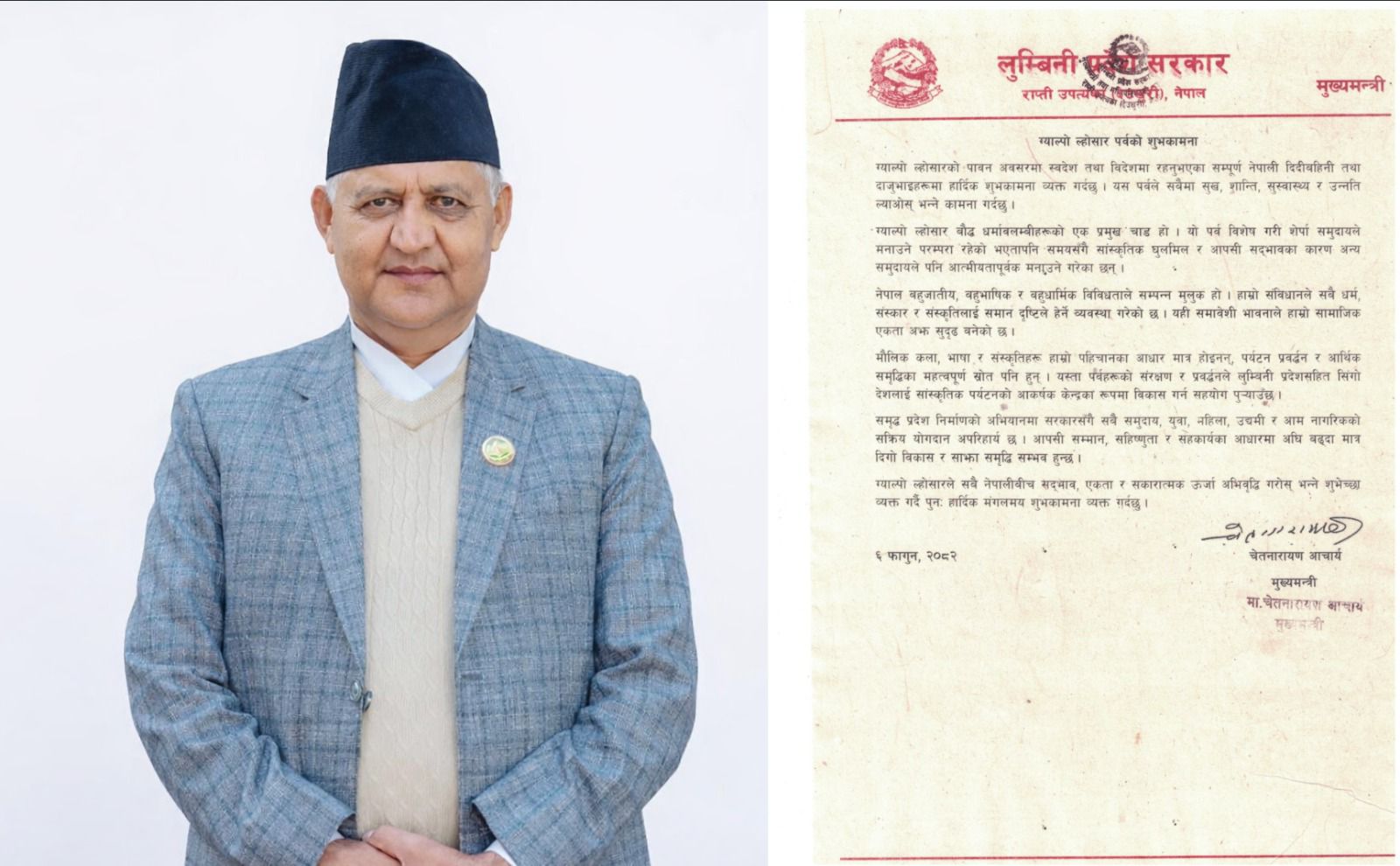 दाङ । लुम्बिनी प्रदेशका मुख्यमन्त्री चेतनारायण आचार्यले ग्याल्पो ल्होसारले नेपाली समाजबीच सद्भाव, एकता र सकारात्मक सोच अभिवृद्धि गर्दै राष्ट्रिय एकतालाई थप सुदृढ बनाउने विश्वास व्यक्त गर्नुभएको छ ।