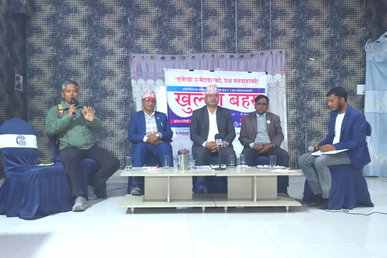 खुला बहस कार्यक्रममा बोल्दै नेपाली कांग्रेसका उम्मेदवार हिराबहादुर खत्रीले भदौ २३ र २४ मा भएको नवयुवा जेनजी आन्दोलनको स्मरण गर्दै मुलुकमा रोजगारी सिर्जना, सुशासन स्थापना र युवामैत्री नीति निर्माणमा भूमिका खेल्न उम्मेदवारी दिएको उल्लेख गरे । उनले क्षेत्रको पर्यटन, कृषि, रोजगारी र पूर्वाधार विकासलाई प्राथमिकतामा राख्ने बताए ।