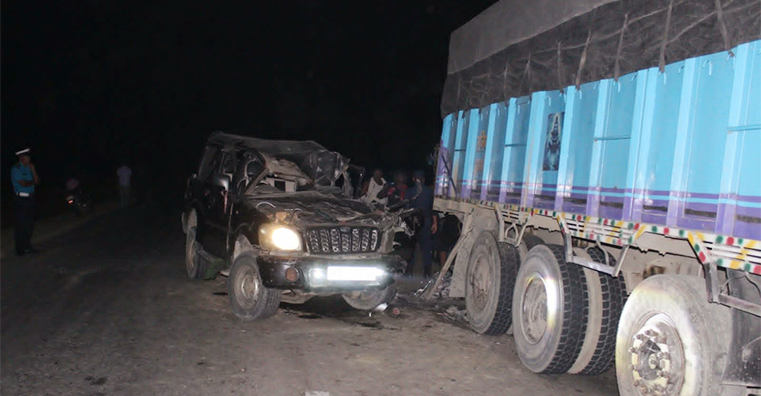 बहादुरगञ्जबाट तौलिहवातर्फ जाँदै गरेको यूपी ३२ सीए ८३४३ नम्बरको स्कार्पियो गाडी अनियन्त्रित भई सडक किनारमा रोकिराखेको लु १ ख ९५४९ नम्बरको ट्रकमा ठोक्किएको थियो ।